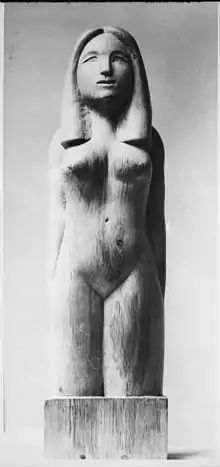Among Moody's most famous works from this period was his great female head, Midonz (1937),[4] which he described as "the goddess of transmutation".[5] By the late 1930s, he had accumulated an impressive collection of work and had a solo show in Paris, France. The success of the show encouraged him to move to Paris in 1938. That year, 12 major sculptures were sent to the Harmon Foundation in the United States to be included in exhibitions at the Baltimore Museum of Art and the Dallas Museum of Art.[6] Moody's success in France was cut short by the onset of the Second World War. In 1940, two days before Paris fell to the Germans, he was forced to flee the city, abandoning his sculptures.[7] (They were retrieved after the war, along with the works that had been sent to the US for exhibition.)[1]