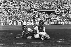 ![]() 15-5-1982 Nr. 1 against nr. 3 of the table: Ajax-AZ'67 3-2. Spelbos (left, AZ'67) and Wim Kieft (Ajax). | |||