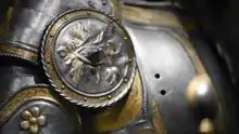 Rondels most commonly hang off breastplates and cover the armpit, which is a vulnerable point.[1] They may also have been used to steady the jousting lance. In this instance they are commonly known as besagews. They also appear on the back of a type of late medieval helmet known as the armet. Their purpose for this is unknown, though it has been surmised that they may protect strapping, or just be some sort of added protection. Rondels also appear uncommonly on the metacarpal parts of some historical gauntlet designs, and appear in some period illustrations protecting the side of the head, and the point of the elbow (where a fan may normally be).