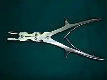 A rongeur is heavy-duty surgical instrument with a sharp-edged, scoop-shaped tip, used for gouging out bone. Rongeur is a French word meaning rodent or 'gnawer'.[1] A rongeur can be used to open a window in bone, often in the skull, in order to access tissue underneath. They are used in neurosurgery, podiatric surgery, maxillofacial surgery, and orthopedic surgery to expose areas for operation.[2]
