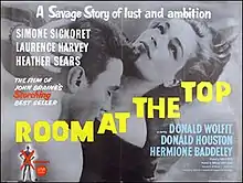 Room at the Top is a 1959 British film based on the 1957 novel of the same name by John Braine. It was adapted by Neil Paterson (with uncredited work by Mordecai Richler), directed by Jack Clayton (his feature-length debut), and produced by John and James Woolf. The film stars Laurence Harvey, Simone Signoret, Heather Sears, Donald Wolfit, Donald Houston, and Hermione Baddeley.