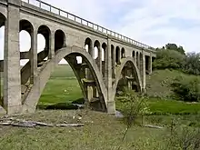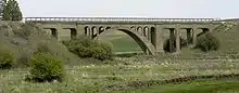 The Rosalia Railroad Bridge was built by the Chicago, Milwaukee, St. Paul and Pacific Railroad (also known as the Milwaukee Road) in 1915 to replace an earlier timber trestle. The bridge was designed as a concrete arch, unusual for a railroad bridge, because it crosses the Northern Pacific Railroad tracks (a rival railroad), a state highway, and is visible from Steptoe Battlefield State Park. The railroad wanted an impressive-looking bridge.[1] The viaduct consists of two spans, separated by an embankment. East of the 334-foot (102 m) embankment there is a 114-foot (35 m) span crossing over the Northern Pacific tracks. To the west is a 502-foot (153 m) span that crosses Pine Creek, railroad tracks, and the highway.