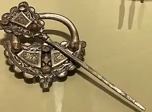 The Roscrea brooch (catalogue number NMI P.737)[2] is a 9th-century Celtic brooch of the pseudo-penannular type, found at or near Roscrea, County Tipperary, Ireland, before 1829.[3] It is made from cast silver, and decorated with zoomorphic patterns of open-jawed animals and gilded gold filigree, and is 9.5 cm in height and 8.3 cm wide. The silver is of an unusually high quality for Irish metalwork of the period, indicating that its craftsmen were both trading materials with settled Vikings, who had first, traumatically, invaded the island in the preceding century, and had absorbed elements of the Scandinavian's imagery and metalwork techniques.[4]