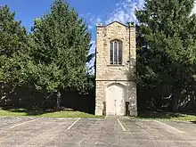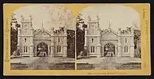 On July 15, 1889, Lake View was annexed by the city of Chicago[5][6] and in 1896 and 1903, the city of Chicago passed ordinances requiring the elevation of the line.[7] It wasn't until 1908 or 1909 that the elevation was completed to Evanston. When the line was elevated, a new station was constructed using stone to match the Castellated Gothic Rosehill Cemetery Administration Building and Entry Gate[1] which was immediately west of the station. The station building was situated at track-level on the east side of the tracks. Passengers and mourners boarded and alighted at a pair of side platforms serving the outer two tracks while a through track ran down the center. Access to the street was by a pair of stairways on the east and west sides of the embankment which led down to the north side of Rosehill Drive. An elevator, executed in the same Castellated Gothic style, was provided on the western (northbound) platform to allow for pallbearers on funeral trains to easily bring coffins down to ground level for interment.