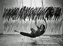 Rosemarie Castoro (1939-2015) was an American artist who worked in drawing, painting, sculpture, and other mediums.[1] She was associated with Minimalism, Conceptual art, and concrete poetry.[1] Castoro was a pioneer of monochrome painting and abstraction. Movement of the human body through physical space was a recurring theme in her work. In the 1960s, she participated in several performances with Minimal Dance pioneer Yvonne Rainer and became involved with the study of choreography at the Pratt Institute.[1] Castoro graduated from the Pratt Institute, Cum Laude, with a BFA in 1963. She was involved with the Art Workers Coalition which met in her studio at 151 Spring Street.[2] In the 1970s, Castoro developed a strong focus on sculpture. In 1971, she created a series of giant minimal sculptures called Free Standing Wall Pieces which encouraged performative interaction. The surfaces of the panels are treated with graphite, gesso and marble dust, thickly applied creating massive rough brush strokes.[1] According to a statement made by her gallery representative, “she was acutely aware that women artists working in a formalist style milieu were not spared the gender-based dismissal of the time,” even while she remained “strictly dedicated to her non-representational abstract style of work.”[3]