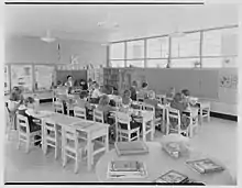 Following the Second World War, the United States saw a population boom and the rise of mass suburbanization.[18] Roslyn was no exception to this. In the late 1940s and early 1950s, new Roslyn housing developments were built, including Strathmore at Roslyn (currently part of the Village of East Hills), built by Levitt & Sons, and Westwood (also part of the Village of East Hills), built by the Westgate Building Corporation.[19][20] Given the influx of new residents and students within the district's boundaries, a handful of new schools were built, in addition to a major building expansion off of the back of the high school.[15]
