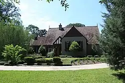 The front elevation gives the appearance of a one-story Tudor cottage, with the rear revealing a full second story. The exterior architecture features steeply pitched gables, half-timbering with stucco infill, prominent chimneys, and casement windows.[2]