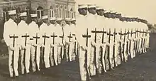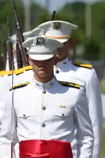 Since inception, the uniform of the Ross Volunteers has consisted of white trousers and blouses with gold trim, worn with peaked hats.[9][lower-alpha 1] Officers wear a distinctive, crimson waist sash.[9]