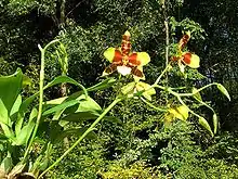 Rossioglossum grande, one of several species known as tiger orchids, is an epiphytic orchid native to the area from Chiapas to Costa Rica.[1][2] The plant may grow four to eight flowers, each up to 13 inches in diameter. The flowers are a glossy bright golden yellow with brown barring. Larger petals are yellow with the lower half red-brown. The lip is white and sometimes flecked with red-brown. The pseudobulbs are gray-green in color, and grow from 4 to 10 cm, each with two leaves.