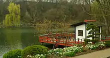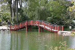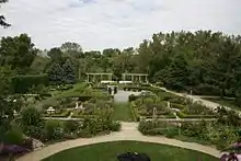 The 20-acre site contains a number of themed gardens, including Japanese, Scottish, French formal, Italian, and English cottage gardens. The Japanese garden borders a pond that is spanned by a red Japanese-styled bridge.[1] A sunken garden is surrounded by limestone walls and perennial plantings. Its entrance is a Tudor-style stone arch that was once the entrance to the Parker Pen Company's world headquarters formerly located in Janesville.[1] There are also less formal gardens, such as a fern and moss garden, and shade, prairie, and woodland gardens.[2]