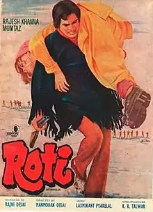 Roti (transl. Flatbread) is a 1974 Indian Hindi-language action film, produced by Rajni Desai and Rajesh Khanna under the banner Aashirwad Pictures Pvt. Ltd and directed by Manmohan Desai. It stars Rajesh Khanna and Mumtaz, with music composed by Laxmikant Pyarelal. This film was released on 18 October 1974, along with Benaam and Roti Kapda Aur Makaan.[1] Kader Khan was reportedly paid ₹1.21 million for writing dialogues for the film.[2] The film was remade in Telugu as Neram Nadi Kadu Akalidi, starring N.T. Rama Rao and Manjula.