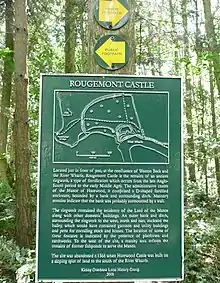 Rougemont Castle in the manor of Harewood, in the parish of Weeton, North Yorkshire, England, is a ruined ringwork castle, now largely hidden within over-grown woodland, located to the south east of the village of Weeton, above the north bank of the River Wharfe, where the river turns in a right-angle at its confluence with Weeton Beck.[1] No above-ground structure survives but the earthwork features remain visible of building platforms, ditch system, outer enclosure and fish ponds.[2]