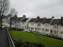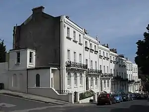 The area's character derives from its "tight urban form" and lack of 20th-century redevelopment, resulting in a homogeneous streetscape of mostly residential buildings in long terraces;[12] its steeply sloping land; and the swathes of trees and gardens which can be seen in long views into the area, which help to "define the unaltered Victorian streetplan" when seen from a distance.[12] Roundhill Crescent "both curves and changes height dramatically along its length". The houses, which on the northwest side of the road are not a continuous terrace and which date from the 1860s to the 1880s,[20] vary in height and the extent of their architectural detailing; canted bay windows and original cast-iron balconies feature prominently.[12][110] Some pairs of semi-detached villas of the 1860s survive on Richmond Road.[12] Prince's Road, where the 223-foot (68 m) summit of Round Hill is located, has a long, well-defined frontage of rendered terraced houses dating from the 1880s, with an older flint and brick house with decorative bargeboards and gables breaking up the composition.[111]