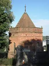 The cemetery chapel (Ohel) at the Jewish burial ground is Grade II-listed.[87] Designed in 1893 by Lainson and Son and built by the Garrett building firm, it is a red-brick octagonal structure in the Queen Anne style, with a tiled turreted roof and corbel-topped piers at each corner, a pedimented entrance and arched windows set below recessed panels.[5][87] The burial ground is surrounded by walls, stucco-faced gate piers and wrought iron fences which are listed separately at Grade II.[88]