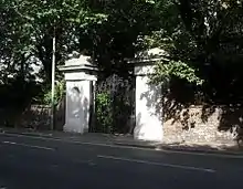 The earliest development in the Round Hill area was Ireland's Pleasure Gardens on the southern slope in 1823. Also known as the Royal Pleasure Gardens,[1] this venture by James Ireland was intended to be a profitable speculation, attracting the increasing number of visitors and short-term residents who had doubled Brighton's population in the previous decade.[24] Ireland, a rich businessman with interests in drapery and undertaking, bought a 10-acre (4 ha) site from Thomas Read Kemp in 1822 and opened the gardens on 1 May 1823.[25] The vast range of attractions included an aviary, maze, formal gardens with a canal, Gothic-style tower, bowling greens, billiard rooms, assembly rooms with a roof promenade, a grotto and a lake. A cricket ground (the Royal New Ground) was also provided and was said to be "the best in the country" at the time.[10][25][26] Despite the range of activities, and occasional high-profile stunts by associates of Ireland (such as a flying demonstration), the gardens never thrived, and soon fell into decline. Ireland sold them in 1826, and later owners presided over further decline until the facility was eventually closed in the 1840s.[25][27] Only its south boundary wall and gate piers, decorated with copies of their original stone lions, survive.[28]