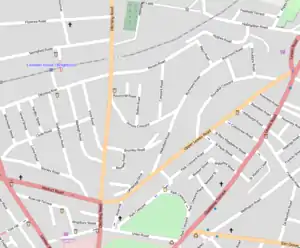 Round Hill is an approximately triangular area directly north of Brighton city centre.[6][2] The name is now applied to a wider area than the 223-foot (68 m) hill at its centre;[7] its boundaries are now defined as Union Road and The Level (a large area of open ground) to the south, the main London Road to the west, the East Coastway railway line to the north—including the London Road viaduct and London Road railway station—and the Lewes Road to the east. Ditchling Road, a third main road, runs through the centre of the suburb.[8][9] The large, round-topped hill which gave the suburb its name stands between the two main valleys along which the original routes into and out of Brighton developed (the present London and Lewes Roads). Ditchling Road, the middle route, climbs the hill. London and Lewes Roads became turnpikes (toll roads) in 1770, and The Level—originally common land between Ditchling Road and Lewes Road—was enclosed and reserved for public recreation in 1822.[10]