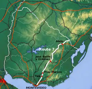 Route 7 is a national route of Uruguay. In 1981, it was assigned the name General Aparicio Saravia, a national hero of Uruguay.[1] It connects Montevideo with Melo in the northeast. The road is approximately 387 kilometres in length.[2]