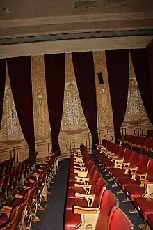 The auditorium decoration repeats the stepped motif of the facade, the ceiling stepping down to meet the walls at an entablature seemingly supported by pilasters. A wavy Art Deco frieze on the entablature and the perforated panels between the pilasters contrast with the angular theme. The wall panels comprise two elements, a central vertical row of five perforated, fan-like elements on each side of which is a vertical row of six rectangles containing diagonal strapping. The light fittings on the pilasters and proscenium splays are designed as angular vase elements. A number of these wall panels are fixed over the shuttered openings to the outside. These as well as the decorative grille running the length of the ceiling in the auditorium were incorporated as a way of ensuring air circulation and cooling in summer and were closed in winter.[1]