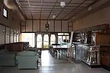 To the south of the theatre entrance vestibule is the original refreshment bar and passed that one of the original shops which has been set up as a museum celebrating Greeks in NSW. Further south is one other shop which was originally a doctor's surgery. On the northern side of the entry vestibule is the third shop which is used as an extension of the entry vestibule. Further north is Peter's Cafe which is now entered from the theatre entry by a ramp. The cafe floor is terrazzo laid in a geometric pattern and the ceiling is a plaster with timer lattice and a patterned cornice. The cafe's timber dining booths are original as is the timber wall panelling except for that alongside the disability ramp which is a fairly recent addition. While the front bar is original, some of the cafe furniture has been sourced from Fardouli's cafe in Inverell.[1]