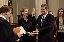 Cooper defeated Republican incumbent Pat McCrory for the governorship in a close race in the 2016 election.[2] On December 5, McCrory conceded the election, making Cooper the first challenger to defeat a sitting governor in the state's history.[3] Cooper took office on January 1, 2017. The Republican-dominated legislature passed bills in a special session before he took office to reduce the power of the governor's office. The legislature has overridden several of his vetoes of legislation. Cooper was reelected in 2020, defeating Republican nominee and Lieutenant Governor Dan Forest.