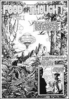 Krenkel sometimes collaborated with Frazetta and Williamson on pages the trio drew for EC Comics particularly in Weird Science, Weird Fantasy and Weird Science-Fantasy. His splash page contribution to Williamson's "Food for Thought" (Incredible Science Fiction 32, November–December 1955), a highly detailed alien landscape, is often regarded as a peak achievement in comic book illustration. Krenkel only drew one solo story for EC, the unsigned "Time to Leave" (Incredible Science Fiction 31, September–October 1955), displaying a futuristic cityscape of architectural splendors. Krenkel inked many of Williamson's comic stories for Marvel and American Comics Group in the 1950s as well.
