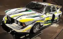 In 1969, Lichtenstein was commissioned by Gunter Sachs to create Composition and Leda and the Swan, for the collector's Pop Art bedroom suite at the Palace Hotel in St. Moritz. In the late 1970s and during the 1980s, Lichtenstein received major commissions for works in public places: the sculptures Lamp (1978) in St. Mary's, Georgia; Mermaid (1979) in Miami Beach; the 26 feet tall Brushstrokes in Flight (1984, moved in 1998) at Port Columbus International Airport; the five-storey high Mural with Blue Brushstroke (1984–85) at the Equitable Center, New York; and El Cap de Barcelona (1992) in Barcelona.[53] In 1994, Lichtenstein created the 53-foot-long, enamel-on-metal Times Square Mural in Times Square subway station.[70] In 1977, he was commissioned by BMW to paint a Group 5 Racing Version of the BMW 320i for the third installment in the BMW Art Car Project. The DreamWorks Records logo was his last completed project.[1] "I'm not in the business of doing anything like that (a corporate logo) and don't intend to do it again," allows Lichtenstein. "But I know Mo Ostin and David Geffen and it seemed interesting."[71]
