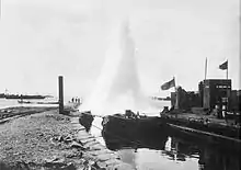 Soon, the Train was put in charge of the landing's water supply, something that had been neglected during the early stage of the campaign. As there was no supply available, water had to be brought by sea, often in petrol tins. This responsibility was given to the Train on 12 August, they were able to source three fire engines and some hoses, which, with the Train's pontoons were used to pump supplies brought from transport ships to tanks on the beach. The fire hoses were kept under guard, and eventually replaced with metal pipe as soldiers would constantly make holes in it to get at the water inside.[8] This was just some of the work that saw the Train removed from the 11th Division and directly attached to the IX Corps Engineers, becoming responsible for all work afloat or on the beach up to the high-water mark that the Navy might require.