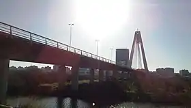 Promoted by the Junta de Extremadura,[1] the foundation stone was laid on 28 September 1992.[2] The project consists of a cable-stayed bridge over the Guadiana with the following spans: (136 + 88 + 32) m.[1] The bridge is continued by a viaduct displaying six spans of 32 m, making a total length of 452 m.[2] The bridge platform, with 2 lanes in each direction, has a width of 23 m.[2] The main pylon, made of reinforced concrete, stands 81.20 m high.[1] It features 28 tension cables.[3]