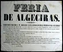 The Royal Fair was established under a royal warrant in June 1850 as a cattle show held in the area known as El Calvario, to the north of the city in the direction of San Roque. The area was devoid of buildings at the time and was the starting point of a popular pilgrimage known as Los Pinos.[1] According to the poster and various contemporary writers, the first fair included fireworks, ship regattas, horse performances and even a bullfight called the toro de la veta, which was banned a few years later. In addition to the entertainments and the cattle show, goods and craftworks from all parts of the Campo de Gibraltar could be bought at the fair.[2]