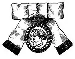 The badge of the order consists of a portrait of the Sovereign set in diamonds, which is suspended from a ribbon. The ribbon of each Royal Family Order changes with each monarch: Edward VII's was variegated of red, blue, and white (similar to the colors of the Royal Victorian Order) and George VI's was rose pink. Each contained a portrait of the sovereign, usually in uniform (if male), or evening dress (if female). The reverse of the order contains the royal cypher of the sovereign.