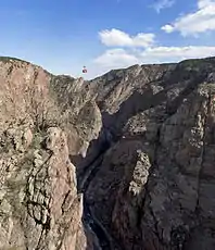The Royal Gorge is a canyon of the Arkansas River located west of Cañon City, Colorado. The canyon begins at the mouth of Grape Creek, about 2 mi (3.2 km) west of central Cañon City, and continues in a west-northwesterly direction for approximately 6 mi (9.7 km) until ending near U.S. Route 50. Being one of the deepest canyons in Colorado, it is also known as the Grand Canyon of the Arkansas (River), with a maximum depth of 1,250 ft (380 m). The canyon is also very narrow, measuring from 50 ft (15 m) wide at its base to 300 ft (91 m) wide at its top, as it carves a path through the granite formations below Fremont Peak and YMCA Mountain, which rise above the north and south rims, respectively.
