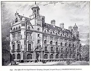 The building was constructed between 1896 and 1903 as the head office of the Royal Insurance Company (Since 1996 part of the ″RSA Insurance Group″). The design was the result of a competition won by James F. Doyle in 1895. The assessor for the competition was Norman Shaw, who was retained as an advisory architect for the project, but it is uncertain what part he played in it.[1] The building is constructed around a steel frame and is the earliest example of this type of construction in the United Kingdom.[1][2] It ceased to be used by the late 1980s, and its condition deteriorated so much that it was placed on the Buildings at Risk Register of English Heritage.[3]