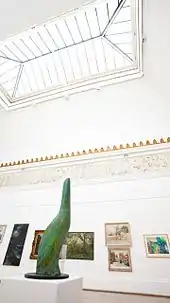 At first, the core of the Academy was a well-known group of artists in Bristol, known as the Bristol Society of Artists, who were mostly landscape painters, and many, such as William James Müller, Francis Danby, James Baker Pyne and John Syer were well known.[3] In 1844, when the Bristol Academy for the Promotion of Fine Arts was founded, the Bristol Society of Artists was incorporated into it. At this time the president and committee was predominantly its patrons, rather than its artists. In 1913 King George V granted the academy its Royal title,[4] with the reigning monarch as its Patron,[5] and by 1914 a major extension to the front of the building, including the dome and Walter Crane lunettes, was completed.[6][7]