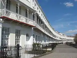 Nos. 1–46 form a crescent which is a Grade II* listed building.[1] Their construction started in 1791 but was not completed until 1820.[2] Nos. 47–50, attached to the eastern end of the main crescent, are Grade II listed.[3] The raised pavement built over vaulted cellars in front of the entire terrace, which is c. 390 metres (1,280 ft) long, is separately listed as Grade II*.[4] Royal York Crescent is reputed to be the longest crescent in Europe.[2]