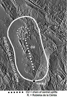 The c. 80 km x 40 km sized Rubielos de la Cérida impact structure (impact basin, resp.) is located in Aragon, northeast Spain, north of Teruel and is considered[1][2][3][4][5][6] a companion of the Azuara impact structure and part of a large multiple impact event, the Azuara impact event, that from stratigraphic considerations and paleontological dating happened in the Upper Eocene or Oligocene (roughly 30 - 40 Mill. years ago). The name is attributed to the village of Rubielos de la Cérida located in the central uplift of the most northerly part of the structure.