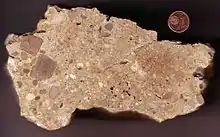 The impact nature is documented by impact melt rocks, suevite, abundant polymictic and monomictic breccias, breccia dikes (dike breccias), extensive megabreccias, impact ejecta, dislocated megablocks, peculiar geological structures in the rim and central uplift zones, and shock metamorphism.[2][3][4][5] Shock effects comprise melt glass, diaplectic glass from quartz and feldspar, planar deformation features (PDFs) in quartz and feldspar and moderate shock effects like intense kink banding and multiple sets of planar fractures (PFs) in quartz, multiple sets of kink bands in mica, and intense micro-twinning in calcite. Moderately developed shatter cones[8] add to the impact signature.