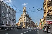 - No. 40 — former Ioffe revenue house, 1913. The flatiron building with decorative tower serves as an architectural dominant of the square.