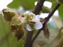 Rubus reflexus is a prickly shrub up to 2 meters (80 inches) tall. Leaves are simple (not compound), palmately lobed, covered with hairs. Flowers are white. Fruits are red.[2][3]