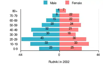 According to the 2002 Poland census, there were 410 people residing in Rudniki village, of whom 50.7% were male and 49.3% were female. In the village, the population was spread out, with 23.7% under the age of 18, 40.7% from 18 to 44, 18.3% from 45 to 64, and 17.3% who were 65 years of age or older.[1]
