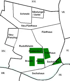 It borders Neubau and Mariahilf in the east, Meidling and Hietzing in the south, Penzing in the west, and Ottakring in the north. The northern border runs along the Gablenzgasse and eastern border along the Gürtel beltway (Neubaugürtel, Mariahilfer Gürtel and Sechshauser Gürtel). It includes the areas of Rudolfsheim (divided into Braunhirschen, Reindorf and Rustendorf), Fünfhaus and Sechshaus.[2][3]