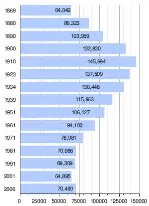 In 1869, the current area covered by the Rudolfsheim-Fünfhaus district already included 64,042 inhabitants, and it was similarly densely populated as it is today. Through the continuous influx of people into the area, the population increased until the beginning of World War I, and had doubled by 1910 at the peak of 145,694 people. Afterwards, a permanent population decline occurred, which was mainly due to higher housing claims. After a historic low of 64,895 inhabitants in 2001, the district population trended to re-grow. Only after the turn of the millennium, did the population in Vienna citywide tend to grow. At the beginning of 2007, the population stood at 70,490 people in Rudolfsheim-Fünfhaus.