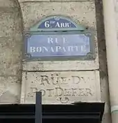 The name 'Rue Bonaparte' was first proposed during the period of The Consulate; it was formally renamed "Saint-Germain-des-Prés" under the Bourbon Restoration, and then officially regained the name of "Bonaparte" a few months after the coup of Louis Napoleon Bonaparte, in August 1852.[1]