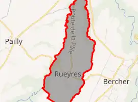 Rueyres has an area, as of 2009, of 2.02 square kilometres (0.78 sq mi). Of this area, 1.4 km2 (0.54 sq mi) or 69.3% is used for agricultural purposes, while 0.36 km2 (0.14 sq mi) or 17.8% is forested. Of the rest of the land, 0.22 km2 (0.085 sq mi) or 10.9% is settled (buildings or roads).[4]