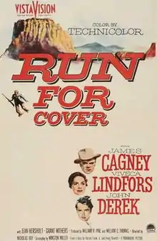 Run for Cover is a 1955 American Western film directed by Nicholas Ray and starring James Cagney, Viveca Lindfors, John Derek, and in his final film, Jean Hersholt.[2] Distributed by Paramount Pictures, this film was made in VistaVision.