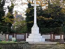 Behind the cross is a sandstone wall divided into five sections by six piers, each section containing a marble plaque.[3] Each plaque carries an inscription and names of the 361 local servicemen who died in the First World War. On the piers are plaques containing the names of the 119 servicemen who died in the Second World War. The granite stone in front of the cross is inscribed with the names of those lost in later conflicts.[lower-alpha 2][2]