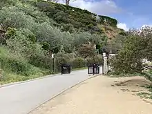 There are five ways to enter Runyon Canyon: two gates at the bottom of the park in the south at Fuller and Vista Streets; a gate at the top of Runyon Canyon Road at Mulholland Drive on the north side of the park, a gate at northwest end of the park at Solar Drive by the trail on West Ridge, and a spine-ridge footpath from the top of Wattles Garden.[12] The trailhead on Mulholland Drive has a parking area while the other trailheads rely on street parking.