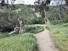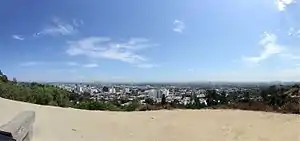 Runyon Canyon Park is a 160-acre (65 ha) park in Los Angeles, California, at the eastern end of the Santa Monica Mountains, managed by the Los Angeles Department of Recreation and Parks.[1] The southern entrance to the park is located at the north end of Fuller Avenue in Hollywood. The northern entrance is off the 7300 block of Mulholland Drive. The Runyon Canyon Road, a fire road that is closed to public motor vehicle access, runs roughly through the center of the park between the northern and southern entrances along Runyon Canyon itself, and there are numerous smaller hiking trails throughout the park.[2] The highest point in the park at an elevation of 1,320 ft (402 m) is known as Indian Rock. Because of its proximity to residential areas of Hollywood and the Hollywood Hills, celebrity sightings are common.[3] The park is also noted for having a fairly liberal dog policy, with dogs allowed off-leash in 90 of the park's 160 acres (0.65 km2).[3][4]