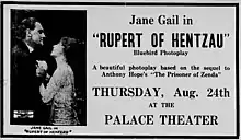 Rupert of Hentzau is a 1915 British adventure film of the silent era. It was directed by George Loane Tucker and starred Henry Ainley, Jane Gail and Gerald Ames. It was based on the 1898 novel Rupert of Hentzau by Anthony Hope, the sequel to The Prisoner of Zenda (1894). It tells the story of the journey of an Englishmen to Ruritania in Eastern Europe where he is forced to impersonate a King to thwart the plans of a villainous aristocrat Rupert of Hentzau.[1]