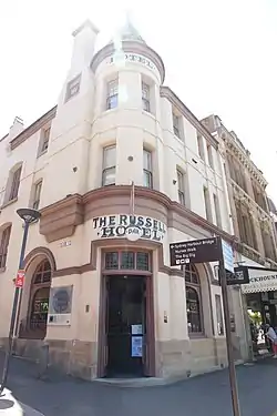 The Russell Hotel is a heritage-listed hotel located at 143-143a George Street, in the inner city Sydney suburb of The Rocks in the City of Sydney local government area of New South Wales, Australia. It was built in 1887. It operated as the Port Jackson Hotel until being delicensed in 1923, after which time a new Port Jackson Hotel was built further along George Street. In 1933, it became the Russell Private Hotel, providing accommodation from the upper floors. The ground floor has been leased for various uses since the original delicensing, initially as a cafe for several decades and most recently as a restaurant and bar. The property is owned by Property NSW, an agency of the Government of New South Wales. It was added to the New South Wales State Heritage Register on 10 May 2002.[1]