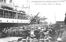 The Russian Expeditionary Force [REF] (French: Corps Expéditionnaire Russe en France, Russian: Экспедиционный корпус Русской армии во Франции и Греции) was a World War I military force sent to France and Greece by the Russian Empire. In 1915 the French requested that Russian troops be sent to fight alongside their own army on the Western Front. Initially they asked for 300,000 men, an unrealistically high figure, probably based on assumptions about Russia's 'unlimited' reserves. General Mikhail Alekseev, the Imperial Chief of Staff, was opposed to sending any Russian troops, although Nicholas II finally agreed to send a unit of brigade strength. The first Russian brigade finally landed at Marseille in April 1916.